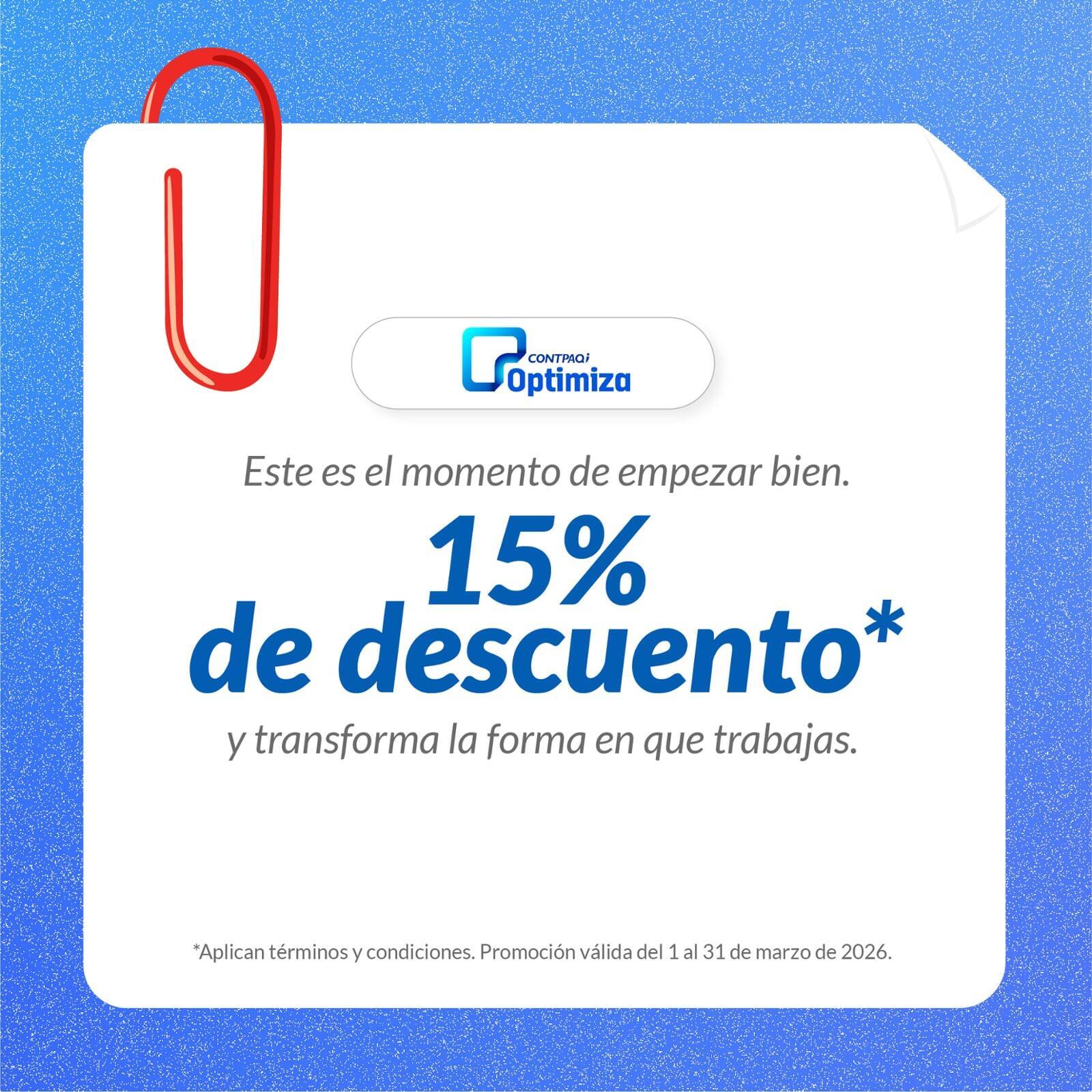 El 15% de descuento aplica en paquete nuevo (licencia nueva) de CONTPAQi Optimiza® adquirido dentro de la vigencia de la promoción.