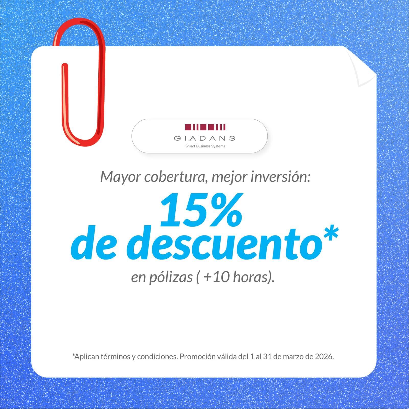 La promoción consiste en 15% de descuento en la contratación de Pólizas de Servicio mayores a 10 horas.