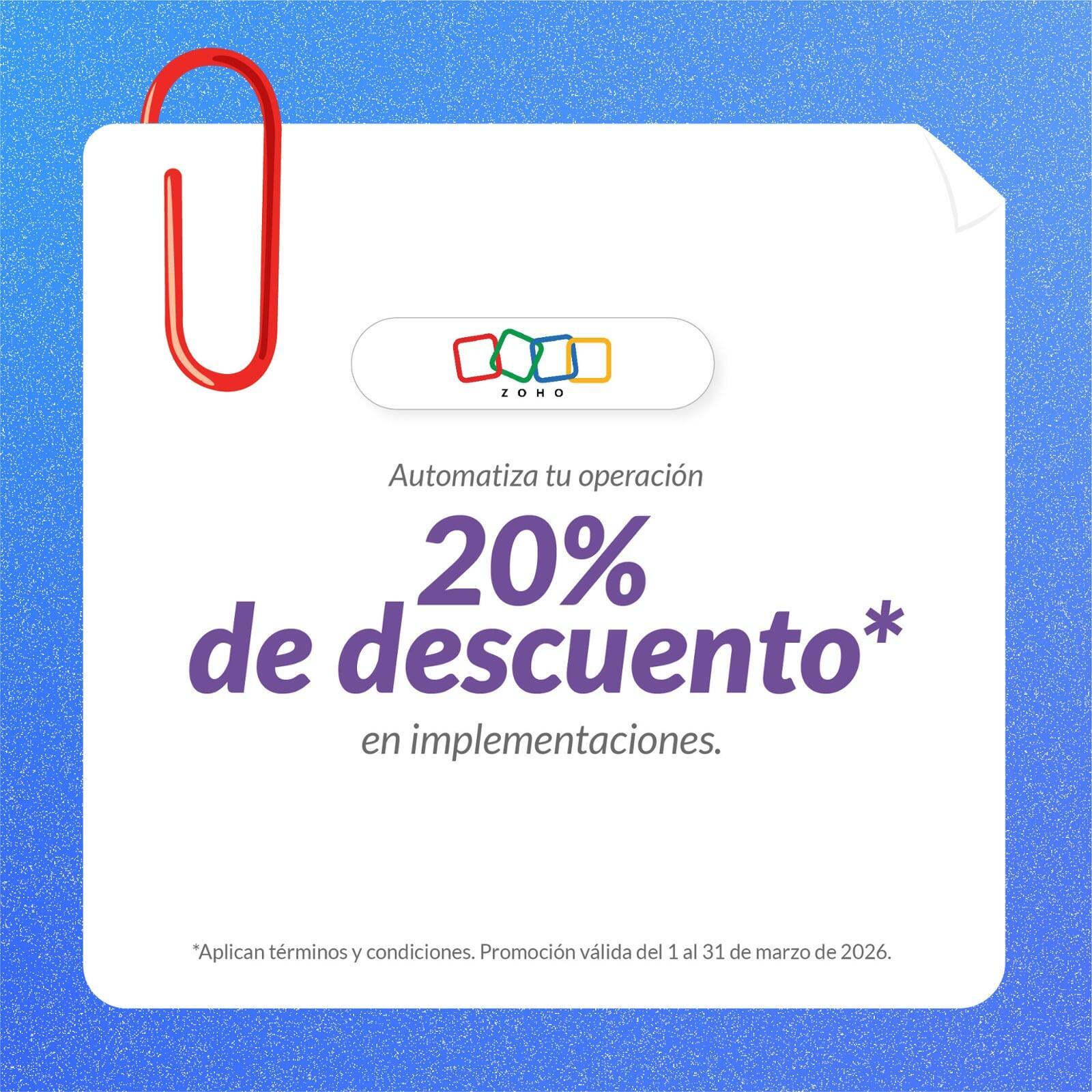La promoción consiste en 20% de descuento en servicios de implementación de soluciones Zoho.