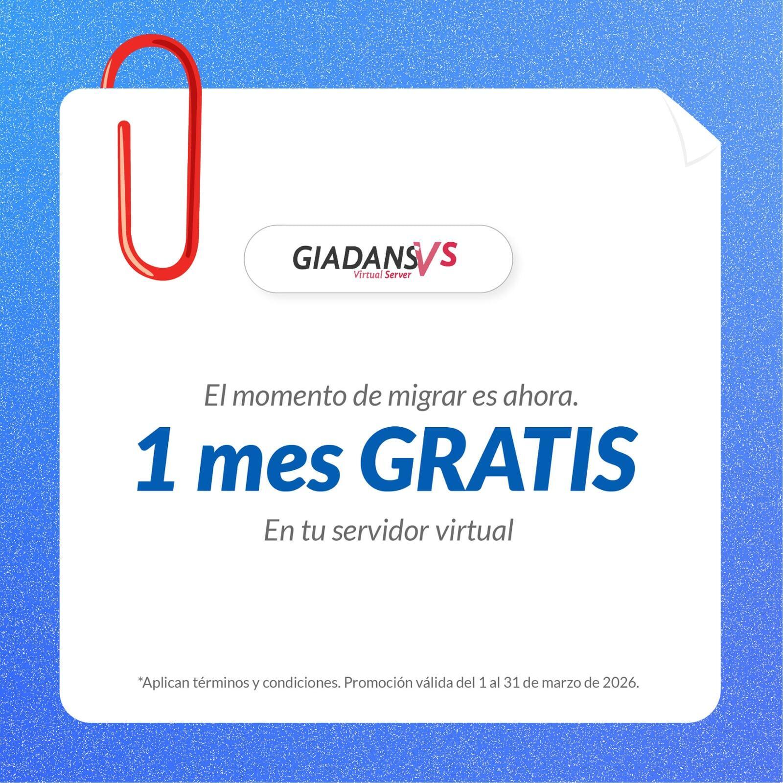 La promoción “1 mes GRATIS en tu Servidor Virtual” aplica únicamente en contratación anual del servicio Giadans Servidor Virtual.