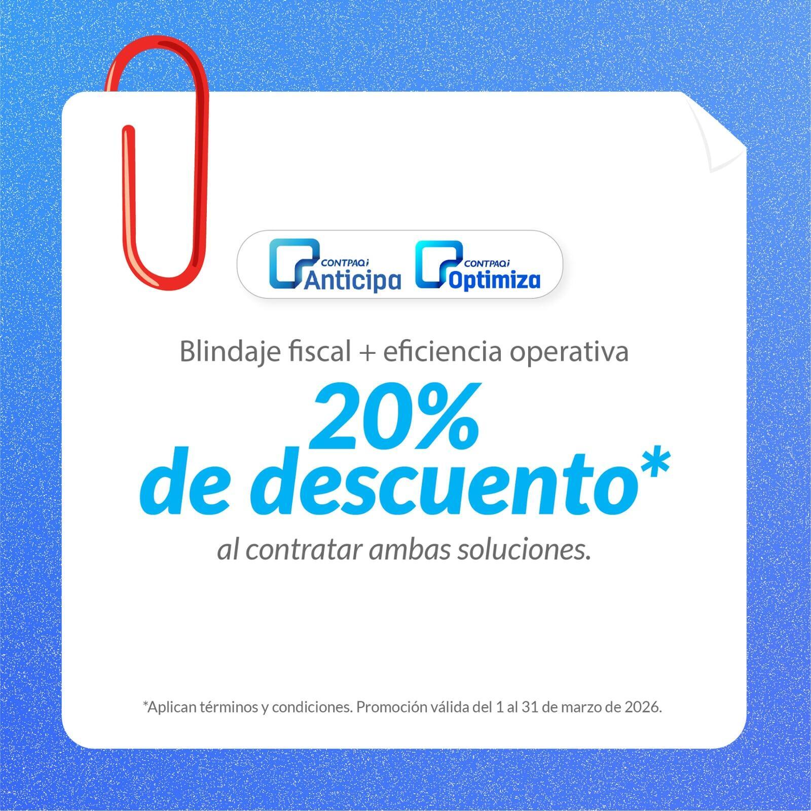 El descuento del 20% es aplicable por la compra del combo Paquete nuevo (licencia nueva) CONTPAQi Optimiza y CONTPAQi Anticipa del 02 de marzo al 29 de abril del 2026.